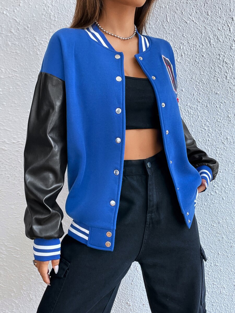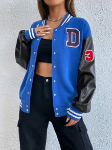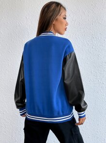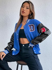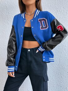 Letter Patched Colorblock Drop Shoulder Varsity Jacket