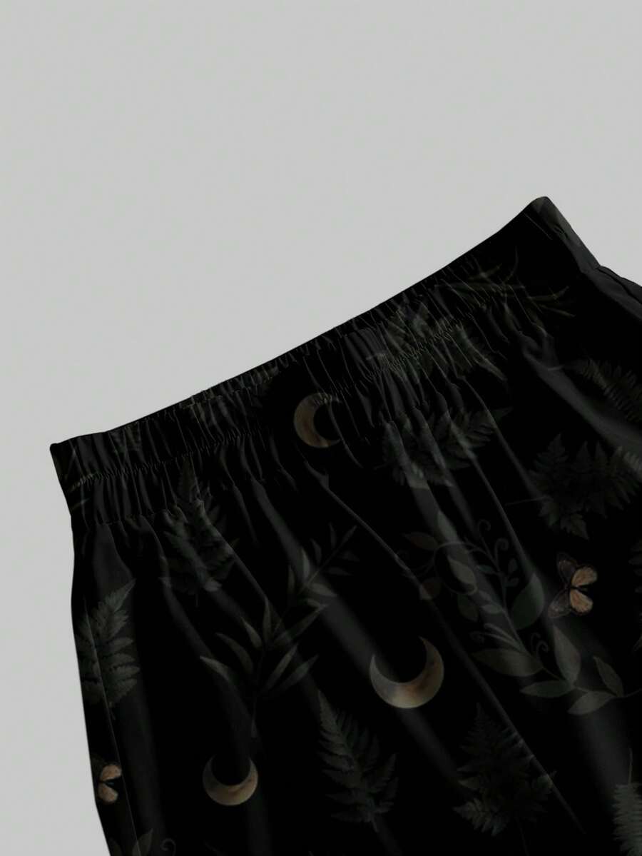 Loose Gothic Moon & Leaf Print Casual Hippy Style Women Black Pants Suitable For Going Out