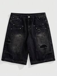 Street Life Men's Rhinestone Distressed Denim Shorts Jorts, Minimalist & Fashionable, Suitable For Summer
