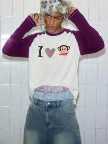 Paul Frank X ROMWE Men's Autumn Rhinestone Heart & Monkey Pattern Contrast Color Raglan Long Sleeve T-Shirt