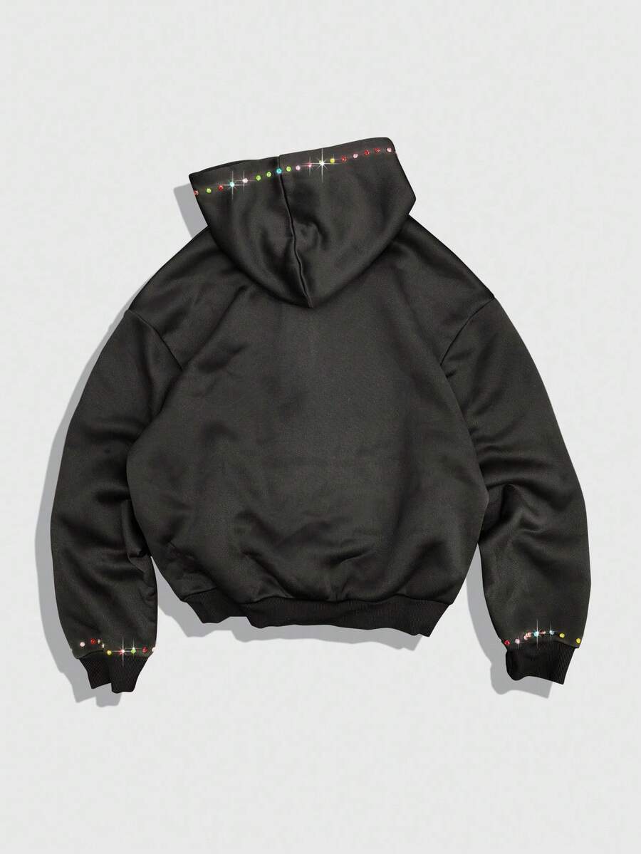 Street Life Men's Autumn Slogan Print Long Sleeve Pocket Rhinestone Decor Drawstring Hoodie