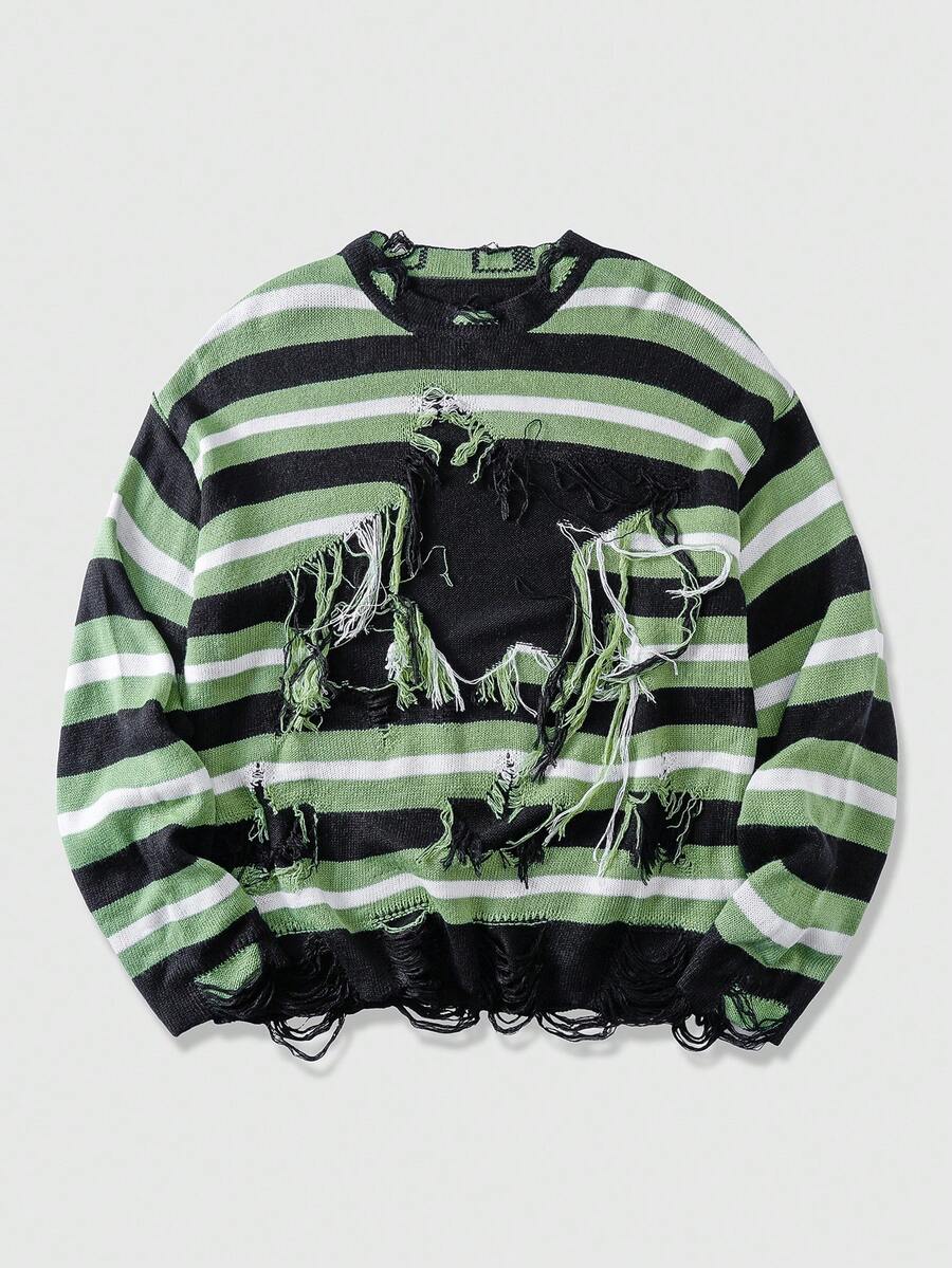 Street Life Men's Autumn/Winter Fashion Contrast Color Striped Fringe Decor Distressed Sweater