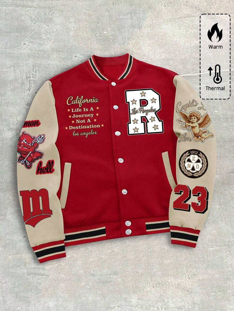 Men's Preppy Casual Contrast Color Patchwork Slogan Print Jacket, Autumn/Winter