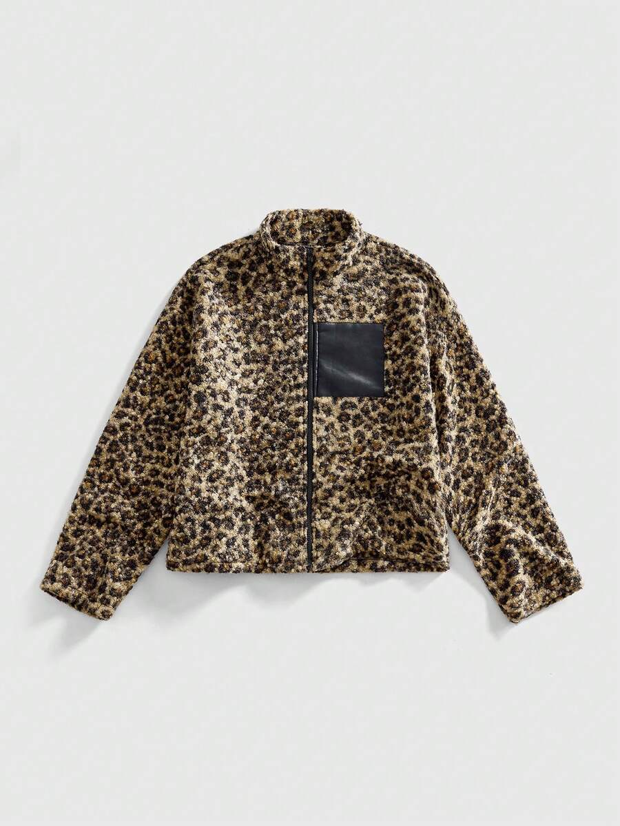 Men's Casual Fashionable Street Punk Leopard Print Patchwork Pocket Zipper Front Jacket, Autumn/Winter