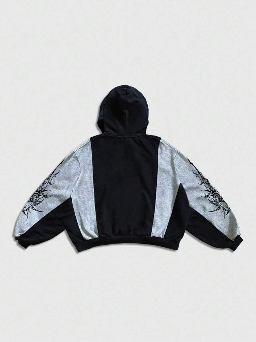 Men's Colorblock Gothic Print Zip-Up Hoodie Sweatshirt, Fall