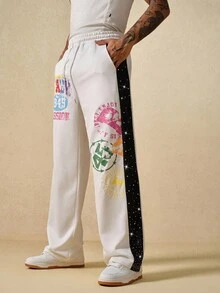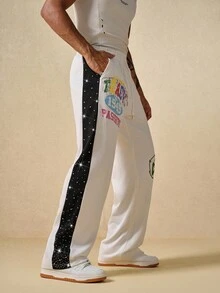 Street Life Men's Contrast Color Patchwork Rhinestone Letter Print Sweatpants