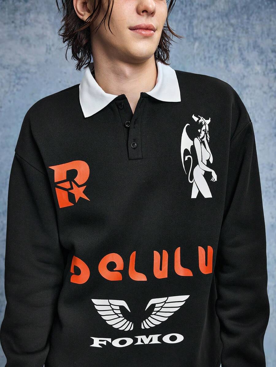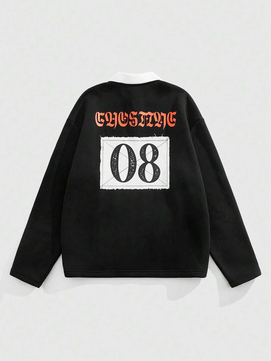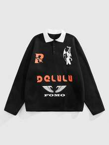 Street Life Men's Contrast Color Polo Collar Letter Print Long Sleeve T-Shirt, For Fall