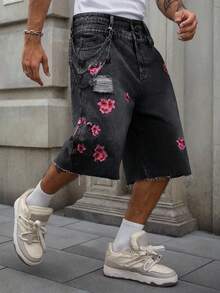 Street Life Men's Double-Layer Waistband Floral Embroidered Denim Shorts