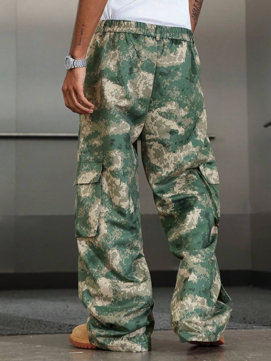 Street Life Men's Fashion Gradient Straight Leg Military Green Camouflage Pants, Multi-Pocket Military Style Vintage Street Long Pants
