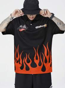 Street Life Men's Flame Print Short Sleeve Polo Shirt, Suitable For Spring And Summer Daily Wear