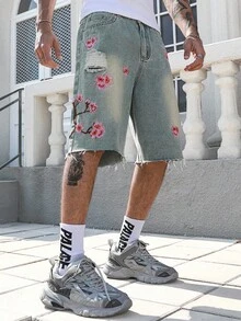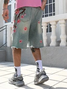 Street Life Men's Floral Embroidery Loose Denim Shorts
