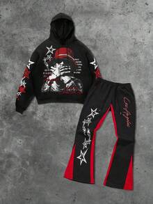 Grunge Punk Men's Graphic Print Hoodie And Contrast Color Sweatpants Set, Streetwear