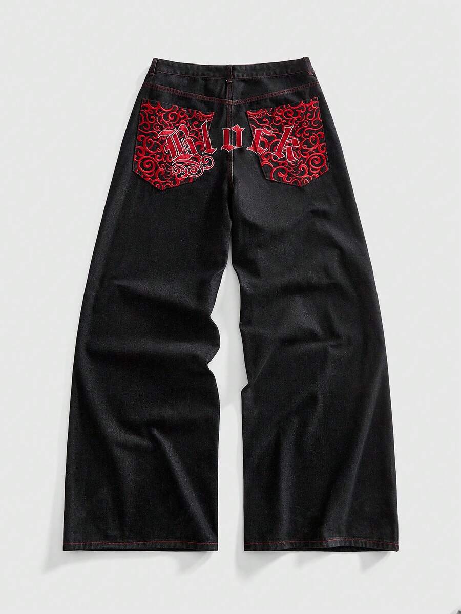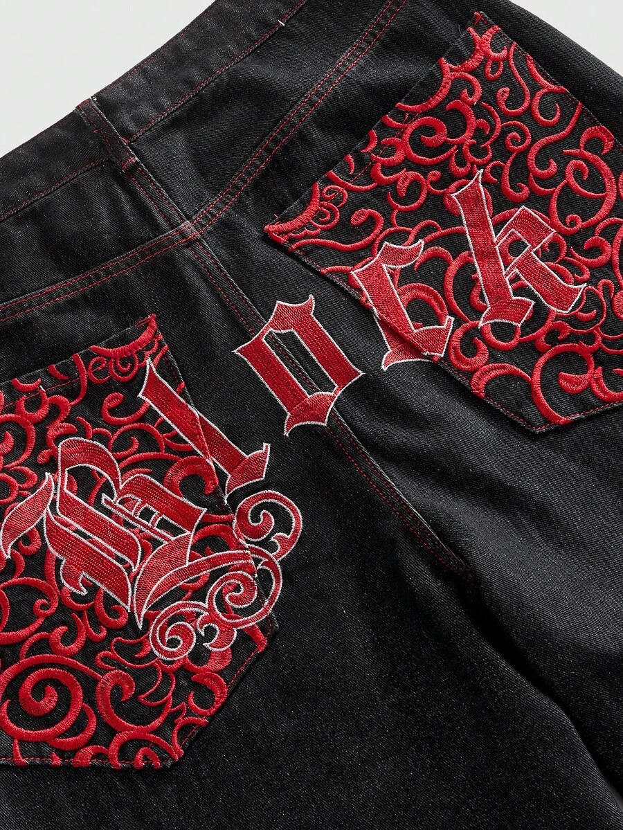 Street Life Men's Loose Fit Contrast Stitching Embroidered Pattern Baggy Jeans, Grunge