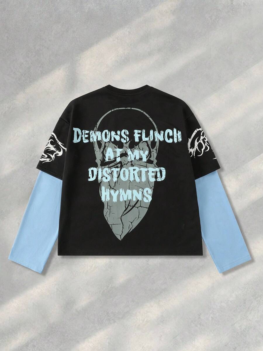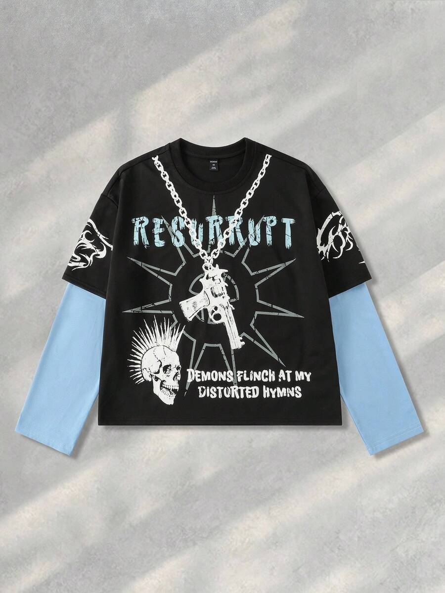 Street Life Men's Patchwork 2 In 1 Print Long Sleeve T-Shirt, Loose Cropped Style, For Fall