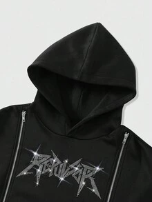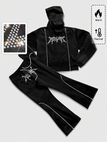 Street Life Men's Rhinestone Decor Long Sleeve Hoodie Sweatshirt And Drawstring Waist Sweatpants Set, Fall Winter Clothes