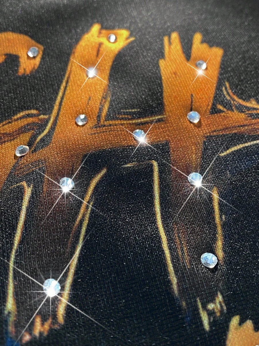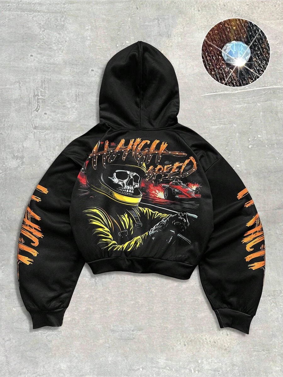 Street Life Men's Rhinestone Decor Skull Print Hooded Long Sleeve Sweatshirt Sweatshirt