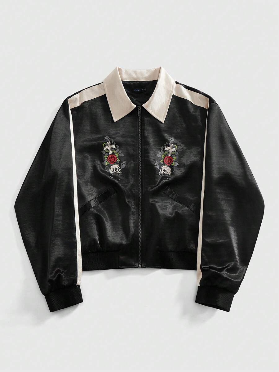 Street Life Men's Skull Floral Print Contrast Color Satin Jacket