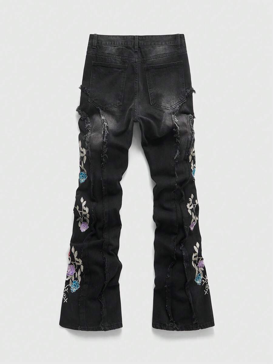 Street Life Men's Washed Distressed Floral Embroidery Patchwork Layered Jeans