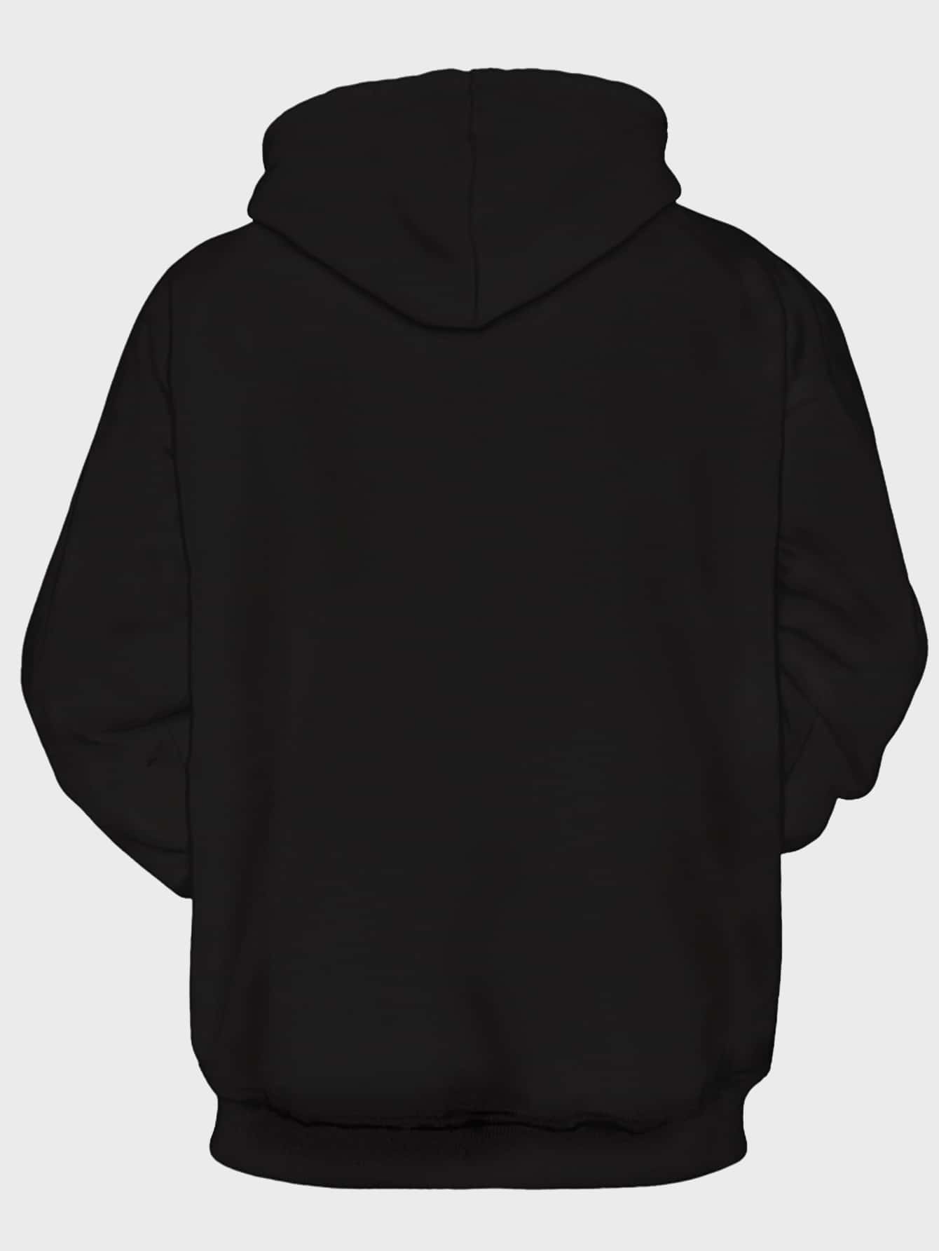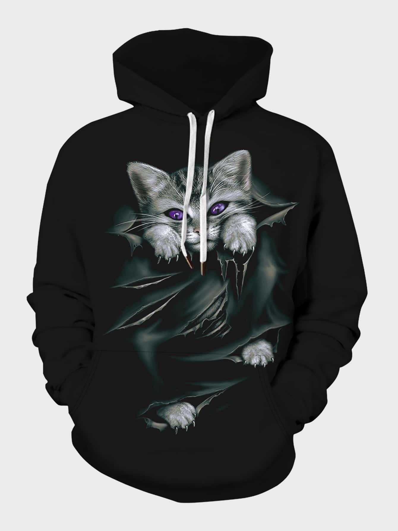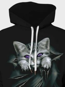 Men Cat Print Kangaroo Pocket Drawstring Hoodie