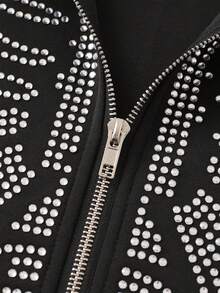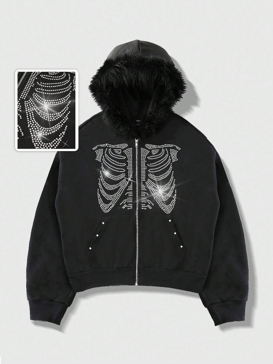 Goth Men Oversized Sparkly Diamond Fuzzy Collar Hoodie Sweatshirt, Loose Short Style, Fall Winter