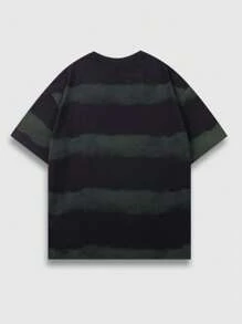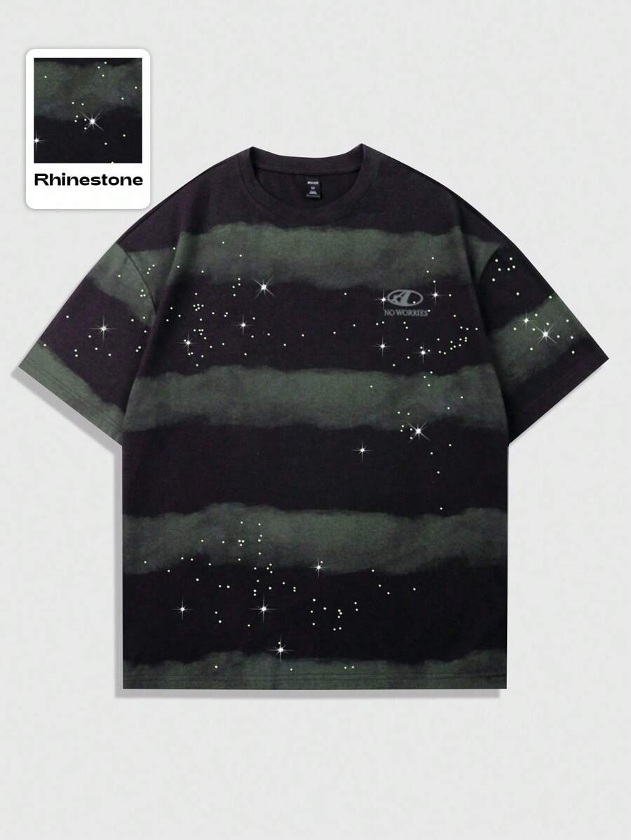 Street Life Men Striped Contrast Color Round Neck Short Sleeve Collegiate Style T-Shirt With Rhinestone Design, 2000s Style
