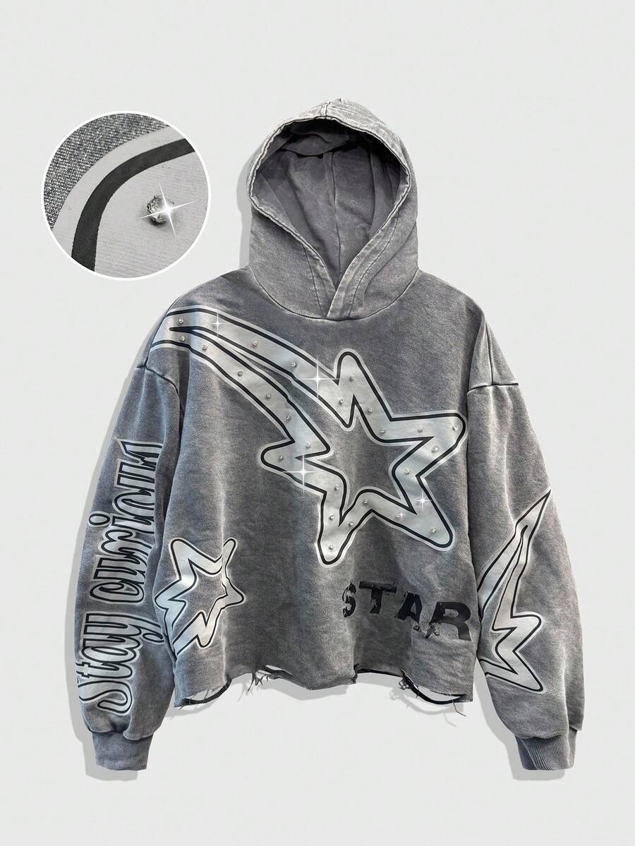 Street Life Men Vintage Shiny Pentagram Pattern Loose Fit Hoodie Sweatshirt, Fall