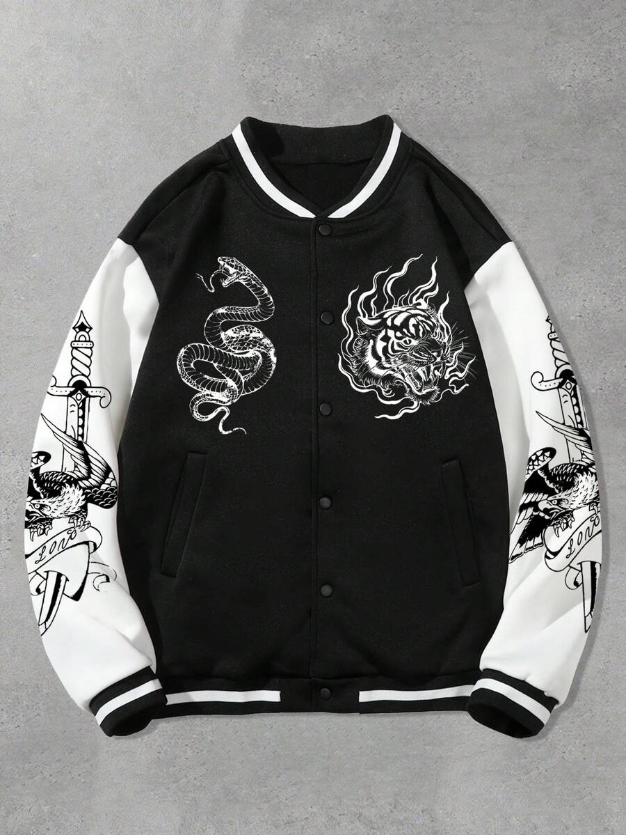 Men's Anime Autumn Snake Tiger Print Contrast Color Single-Breasted Casual Baseball Jacket