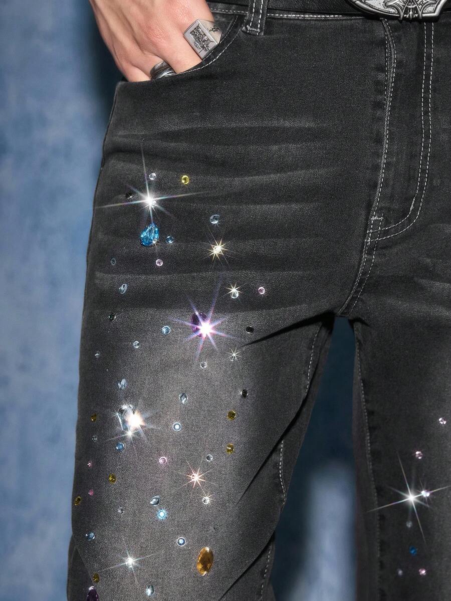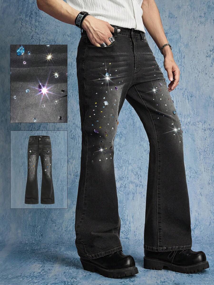 Men's Fashion Skinny Rhinestone Elastic Pocket Flare Jeans