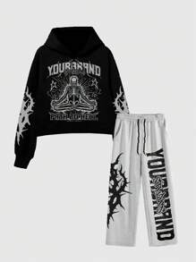 Men's Letter Print Minimalist Hooded Sweatshirt And Front Tie Long Pants Set Tracksuit