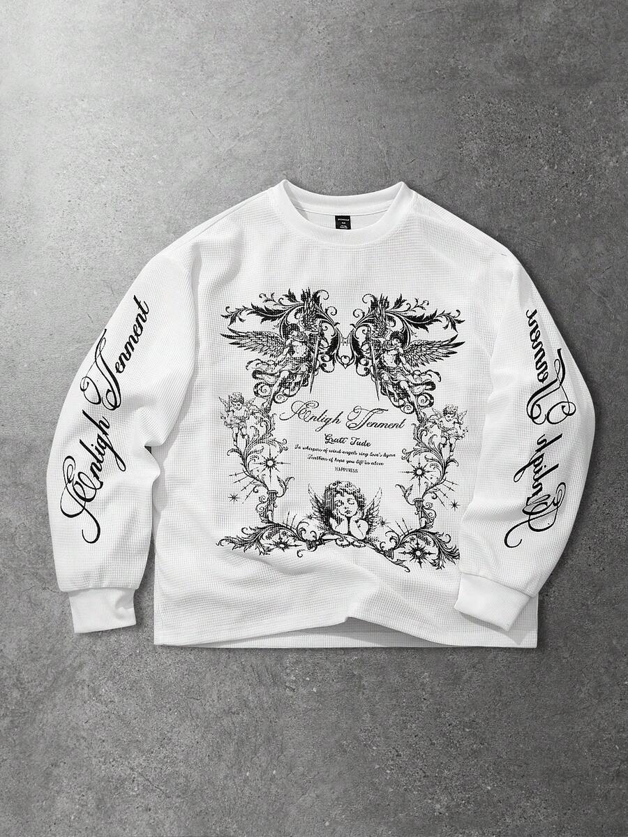 Men's Loose Fit Round Neck Long Sleeve Angel Slogan Print Casual T-Shirt