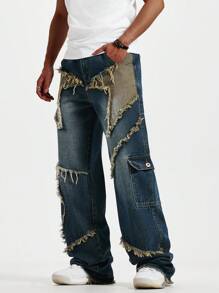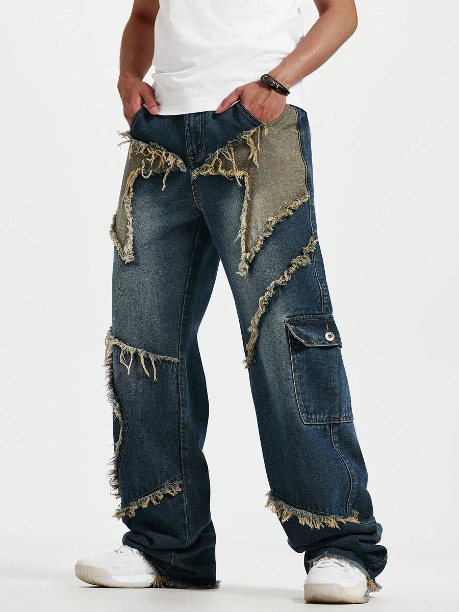 Men's Loose Fit Workwear Jeans With Frayed Hem Design