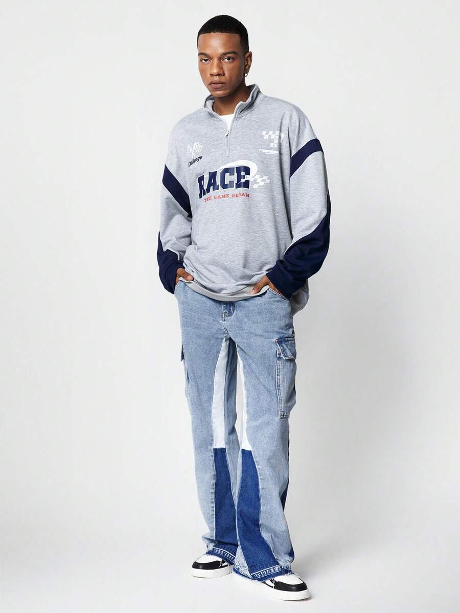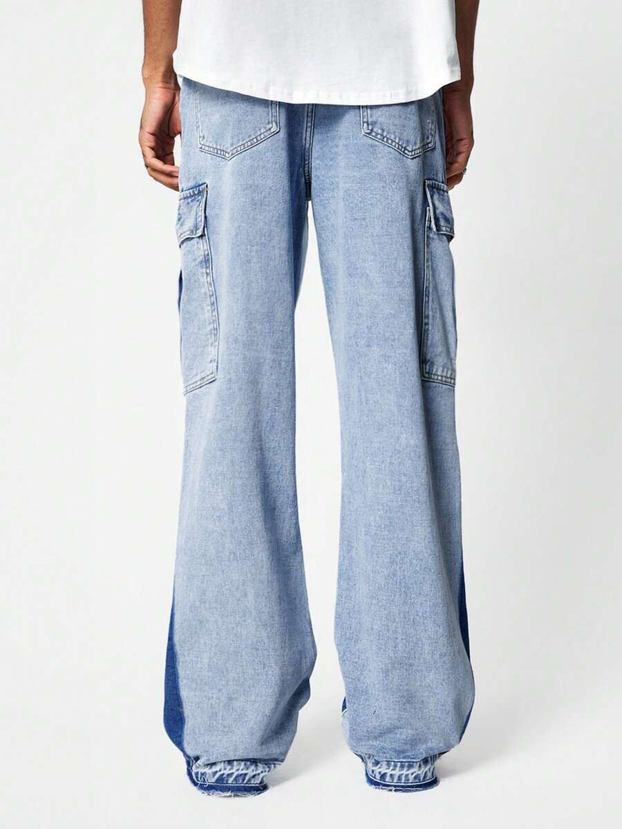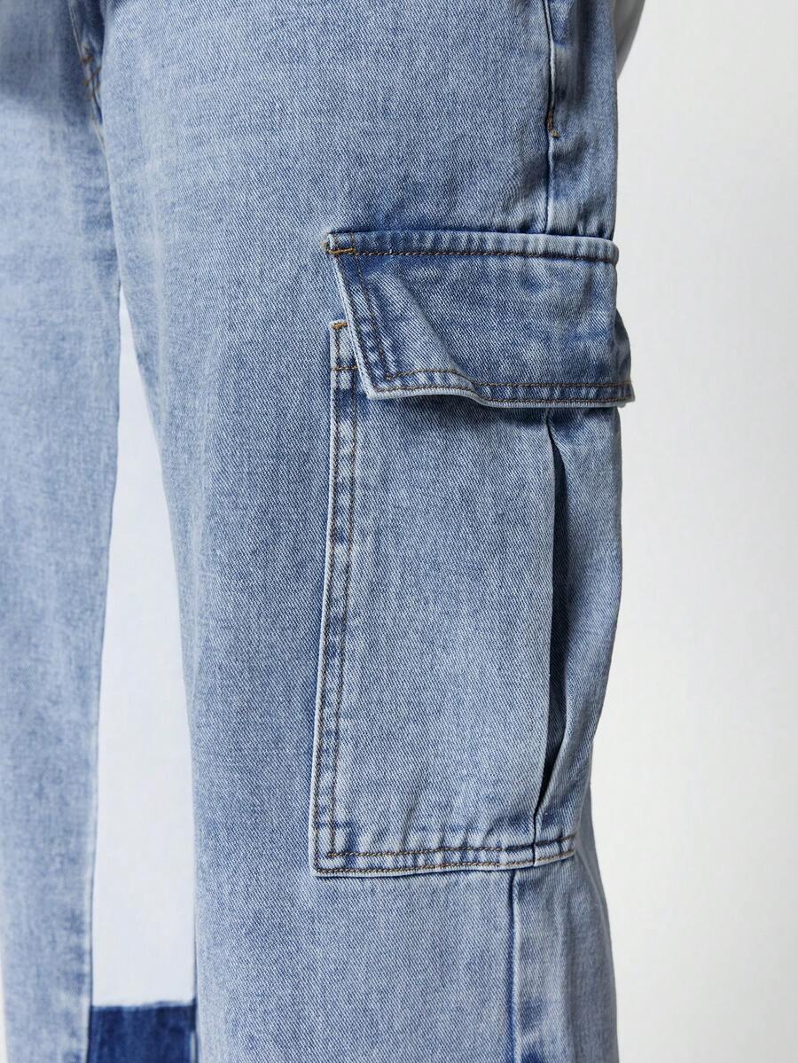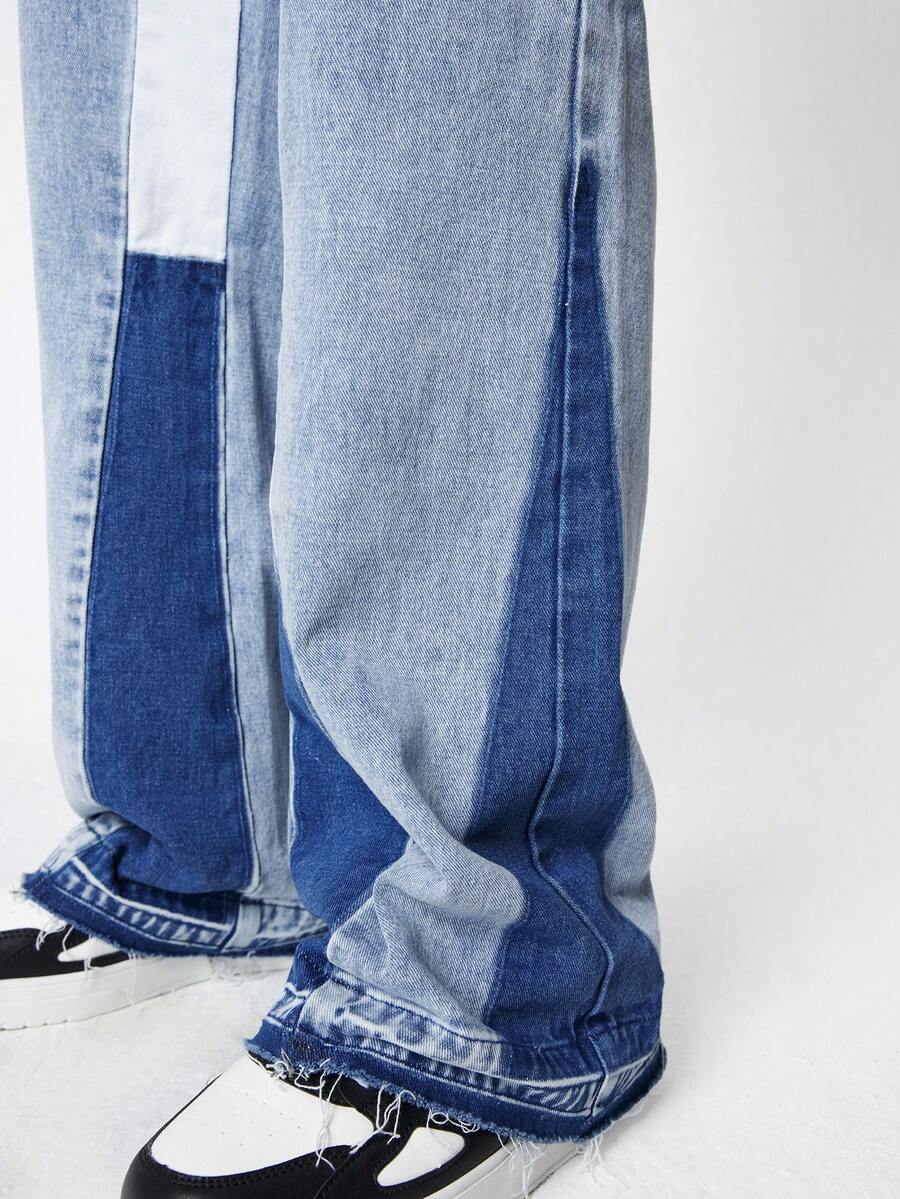 Men's Patchwork Color Block Flared Leg Street Casual Cargo Jeans Pants, School