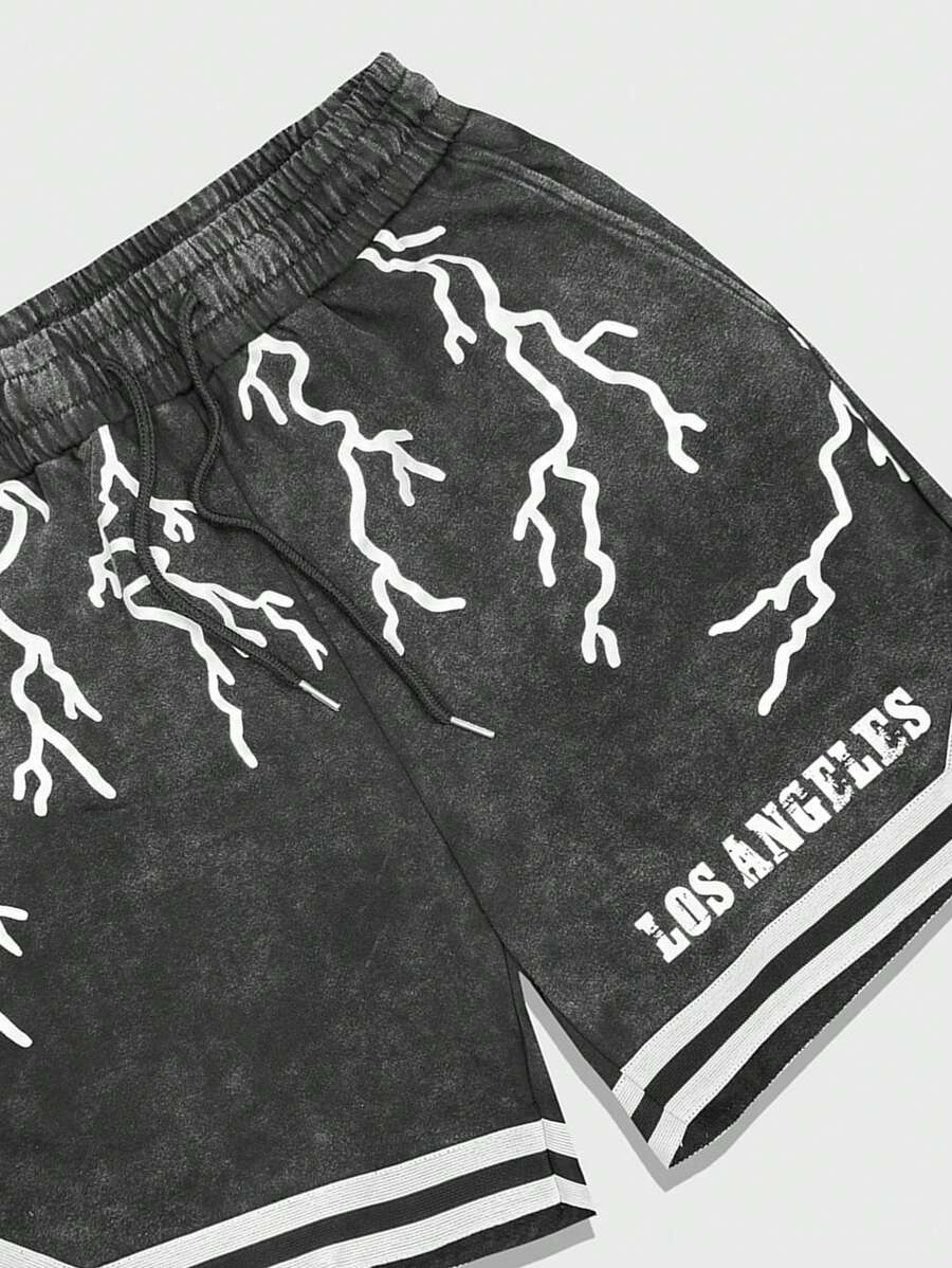 Prep Men's Sporty Casual Washed Lightning Print Colorblock Stripe Shorts, Summer