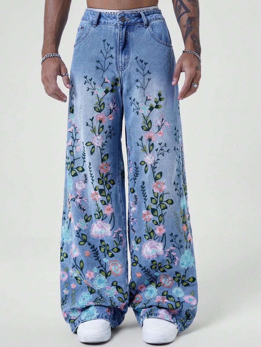 Street Life Men's Street Floral Embroidery Loose Pockets Casual Versatile Jeans