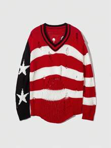 Men's V-Neck Long-Sleeved Striped Design Daily Casual Comfortable Hollow Color Matching Knitted Sweater, School