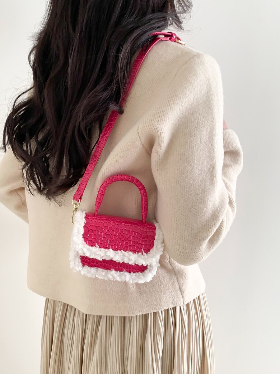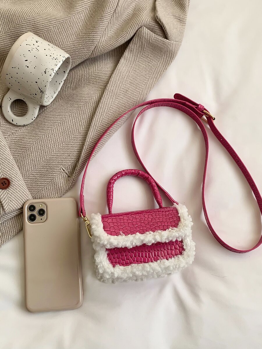 Mini Neon Pink Crocodile Embossed Fuzzy Trim Flap Square Bag