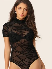 Mock-neck Sheer Geo Mesh Bodysuit Without Bra