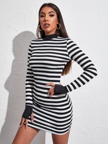 Mock-neck Thumb Hole Striped Bodycon Dress