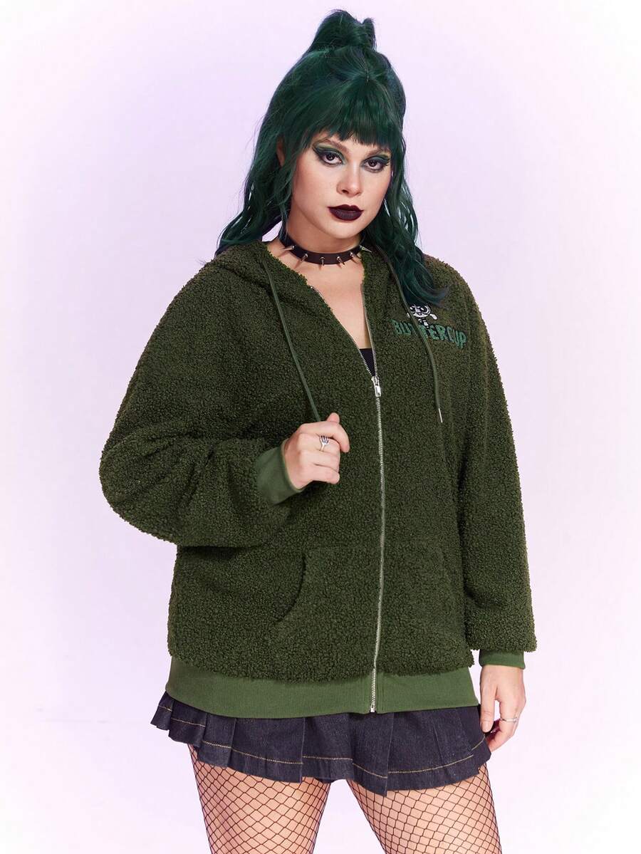 The Powerpuff Girls | ROMWE Plus Letter & Cartoon Embroidery Zip Up Drawstring Hooded Coat