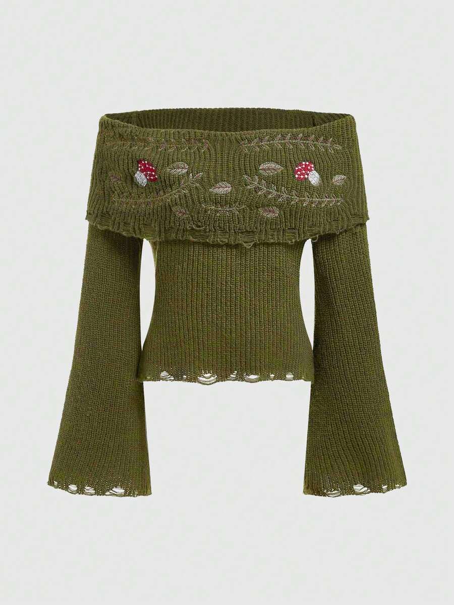 Fairycore Mushroom & Vine Embroidery Off-Shoulder Flare Sleeve Distressed Sweater