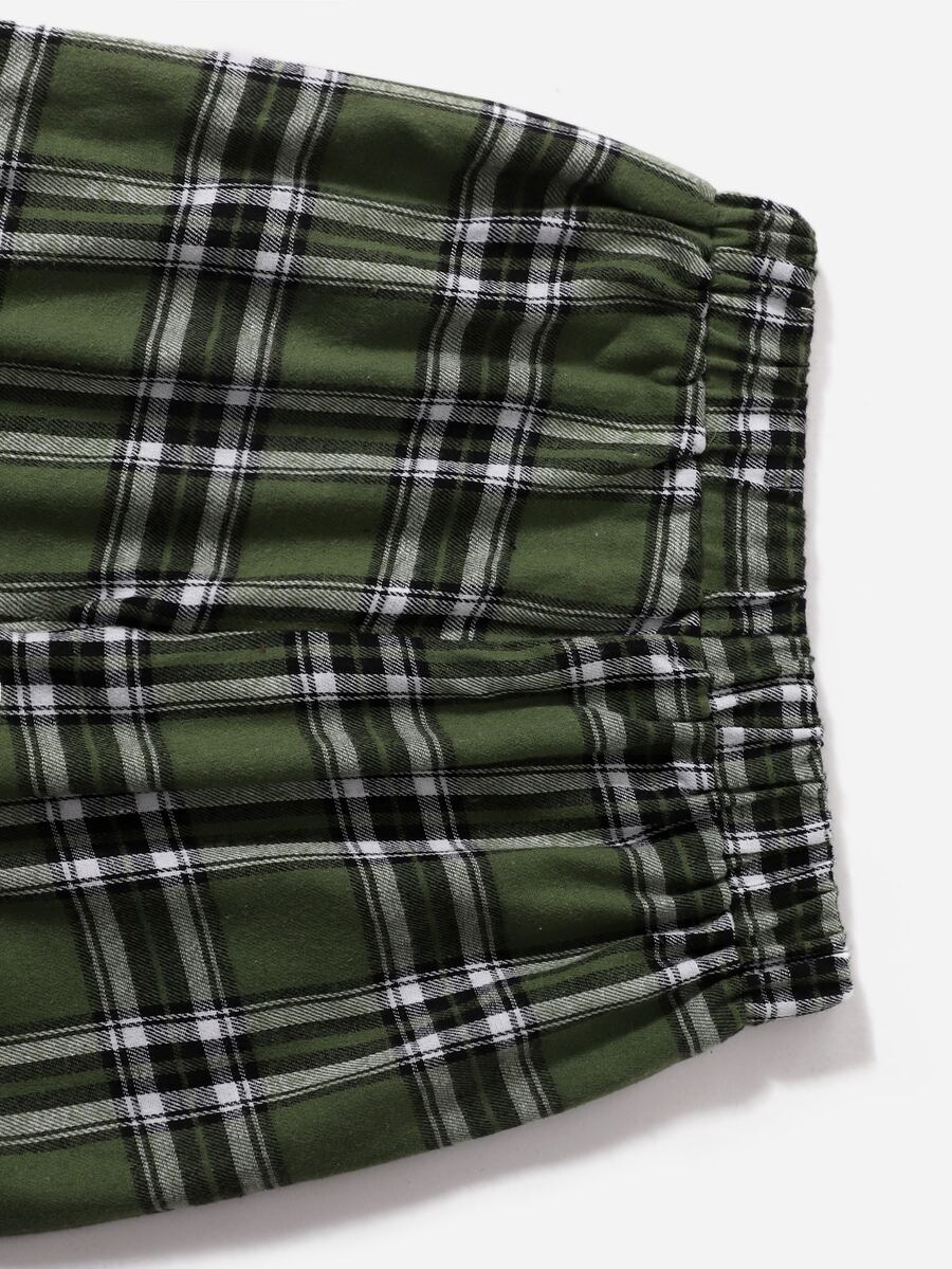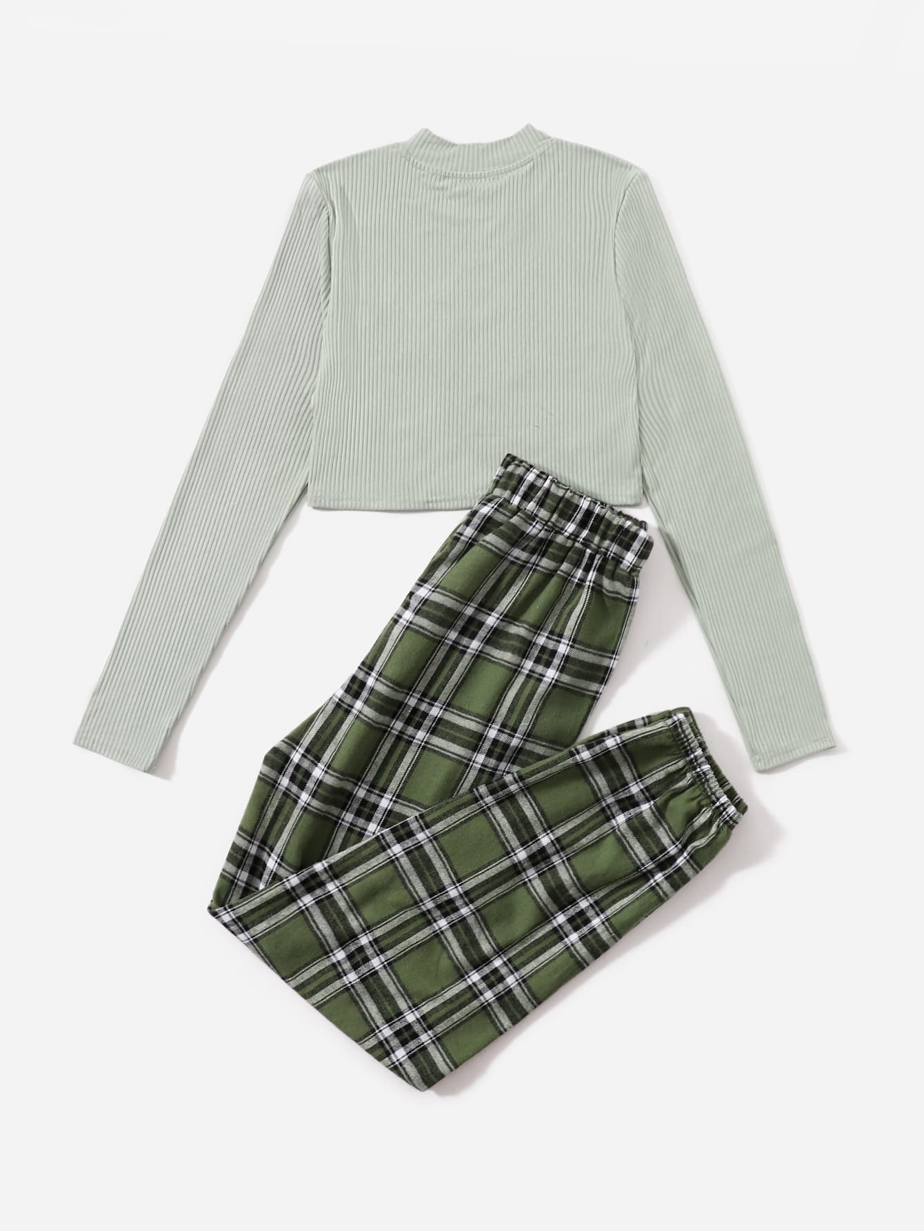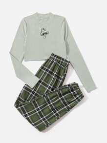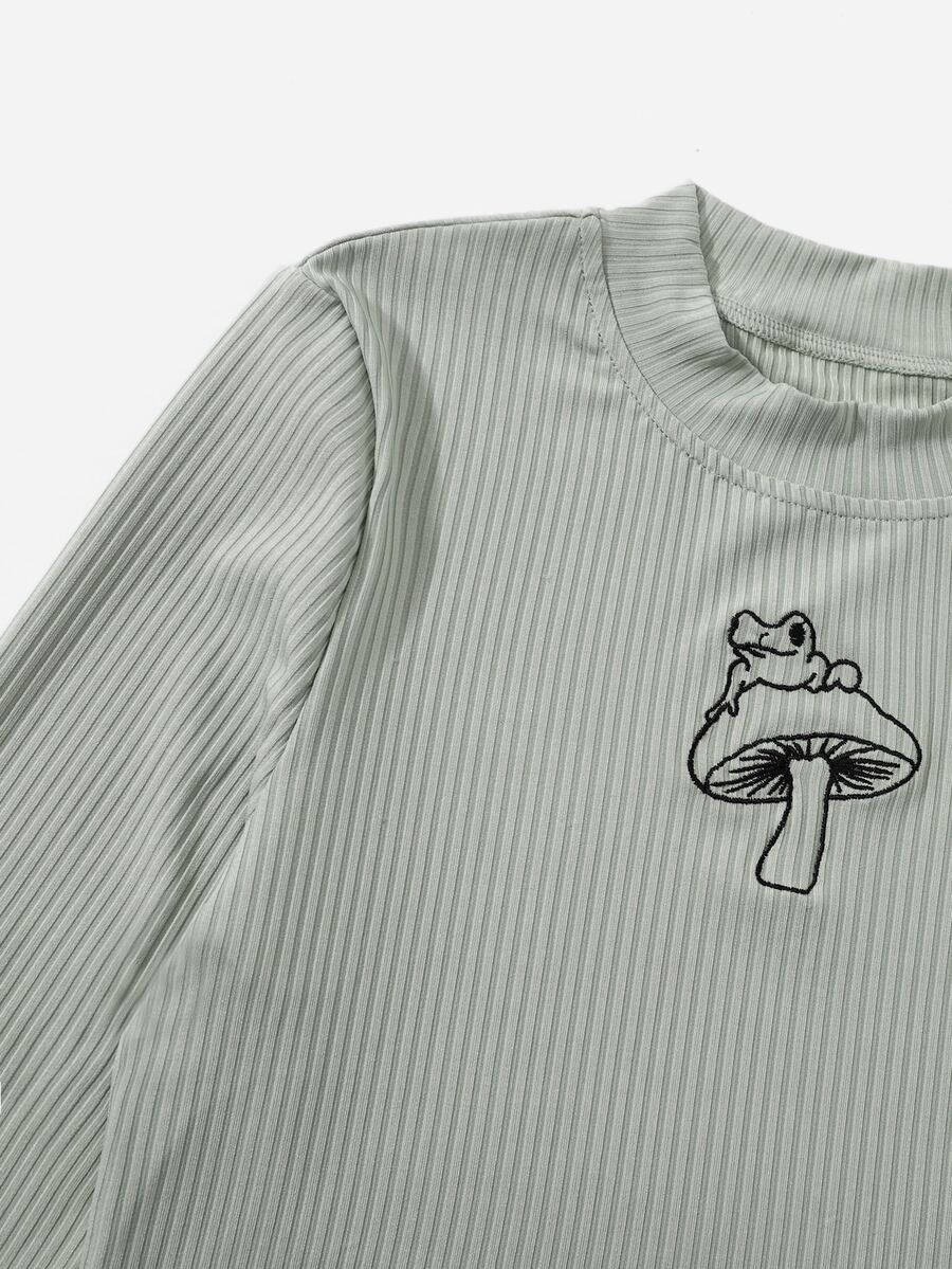 Mushroom & Frog Embroidery Ribbed Crop Tee & Plaid Pants