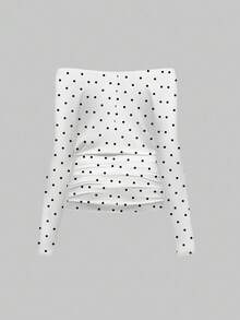 Kawaii Music Note, Cute Star, Y2K Polka Dot, Vintage Sexy Off Shoulder Ruched Loose Fit Crop Top, White Printed Long Sleeve T-Shirt For Women