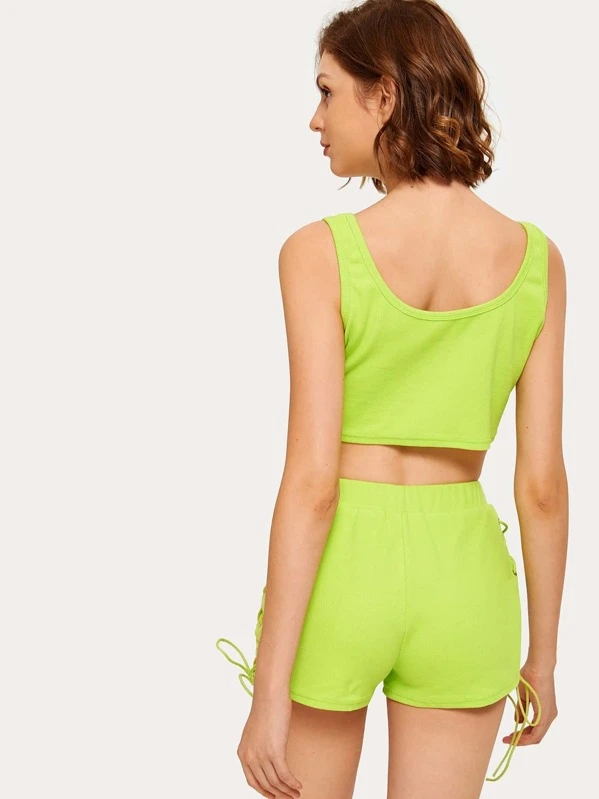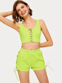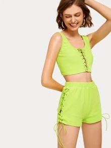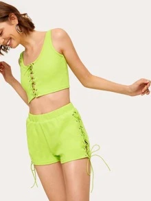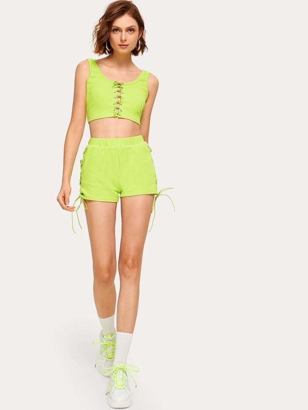 Neon Green Eyelet Lace-up Tank Top & Shorts
