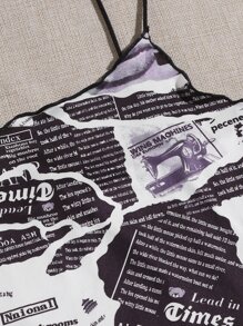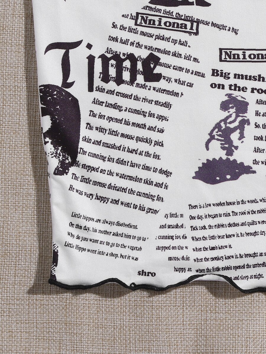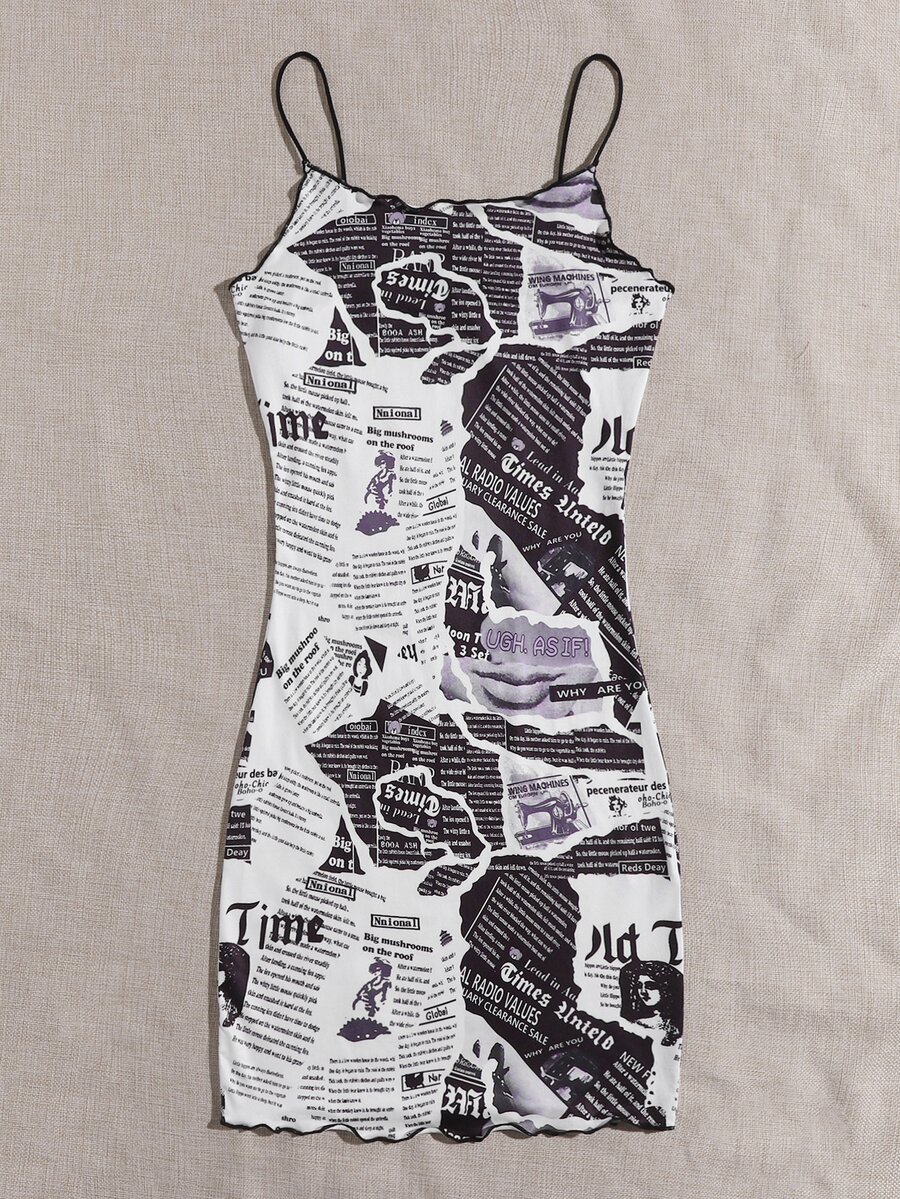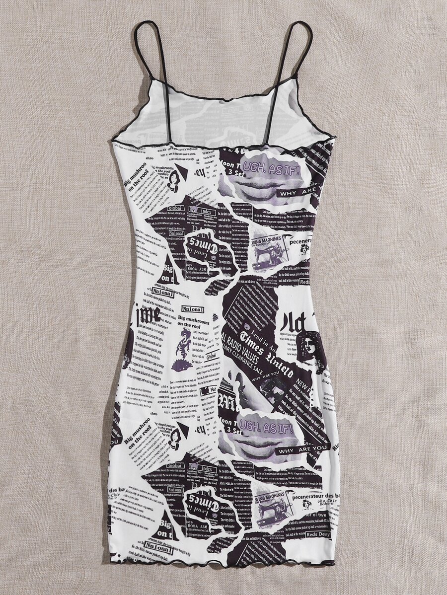 Newspaper Print Lettuce Trim Bodycon Dress
