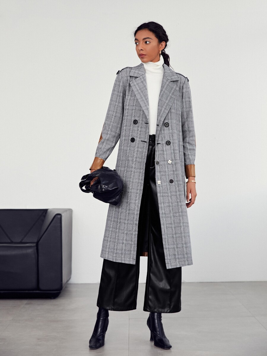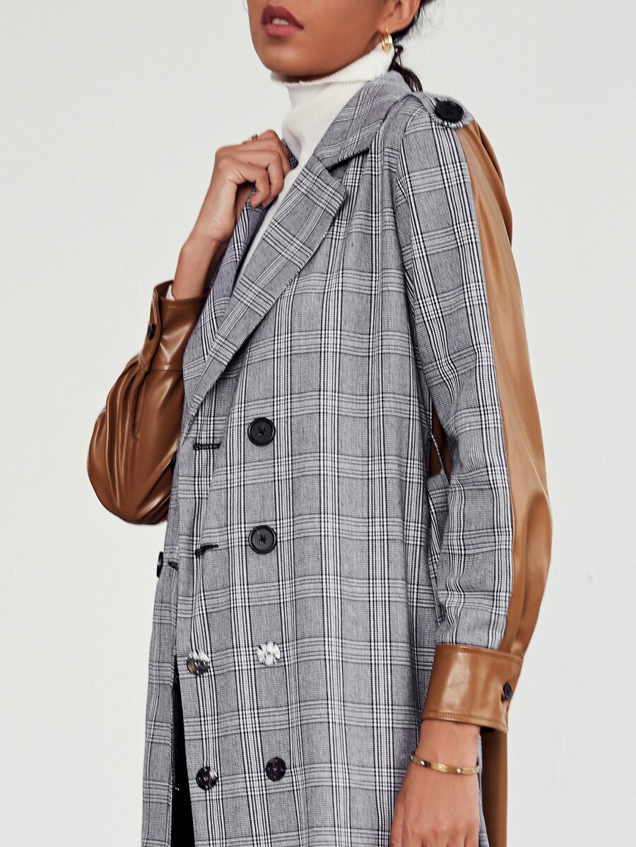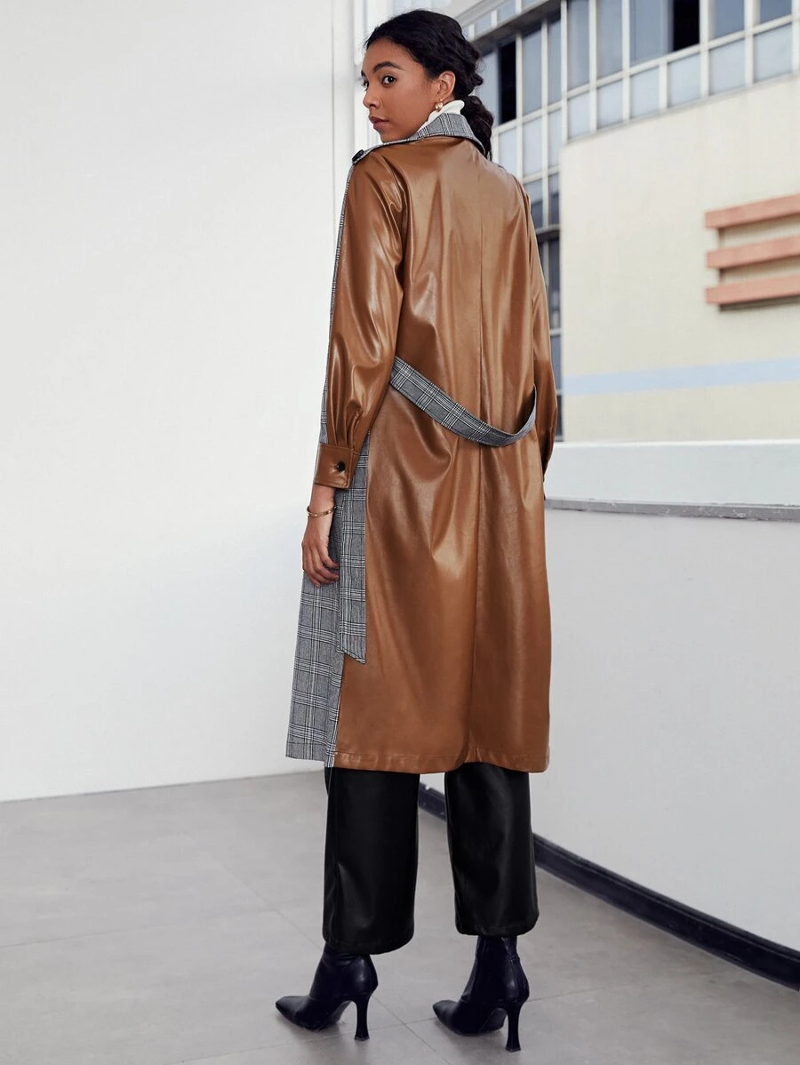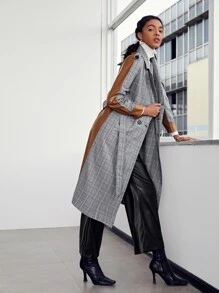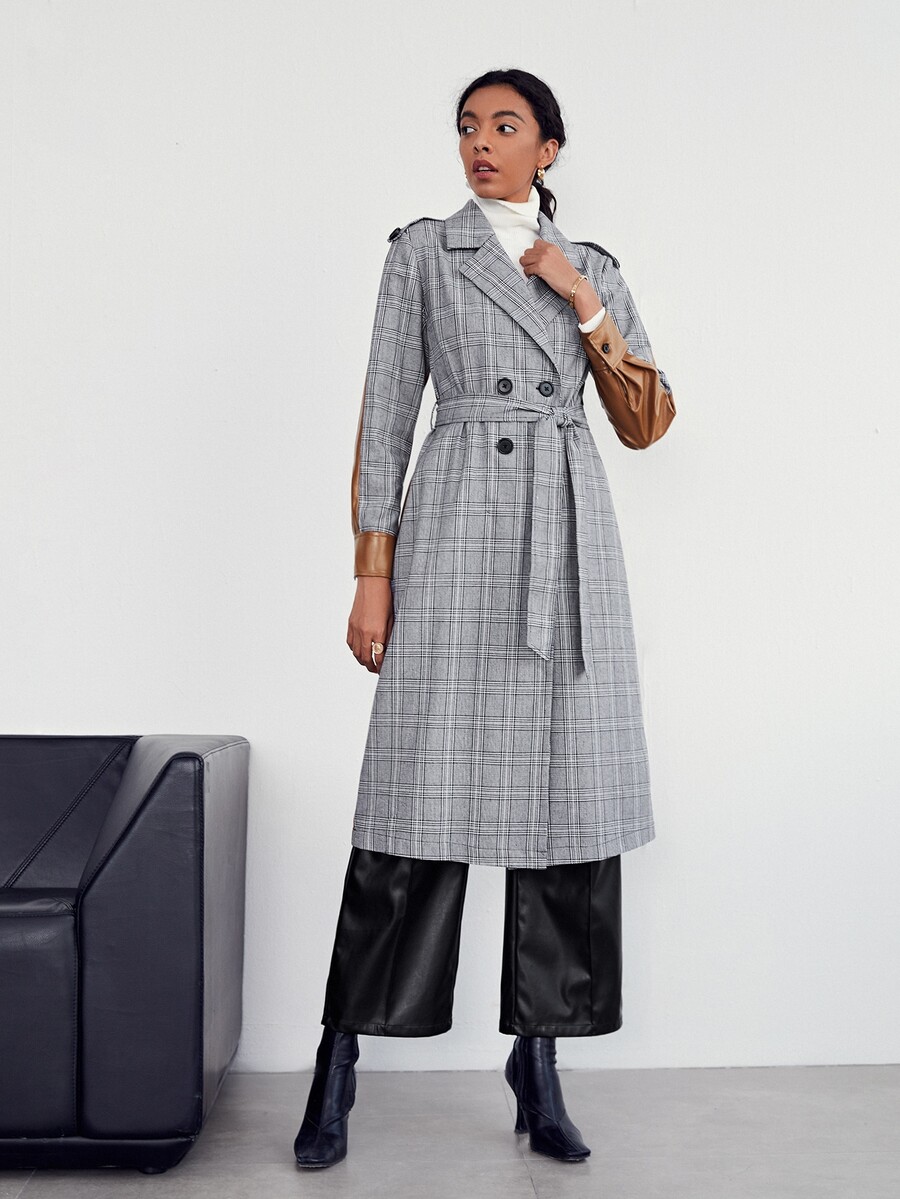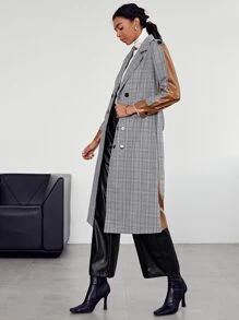 Notched Collar Double Breasted Belted Mixed Media Plaid Trench Coat