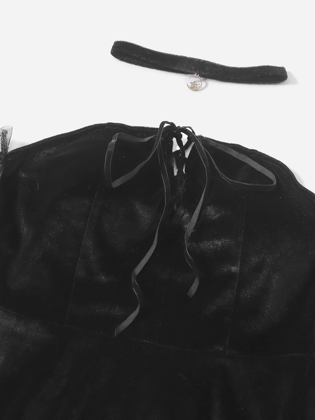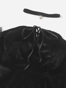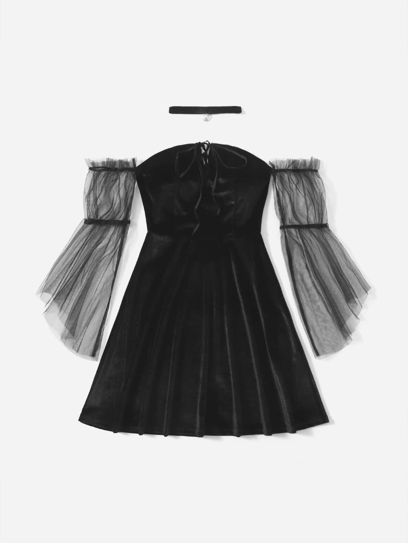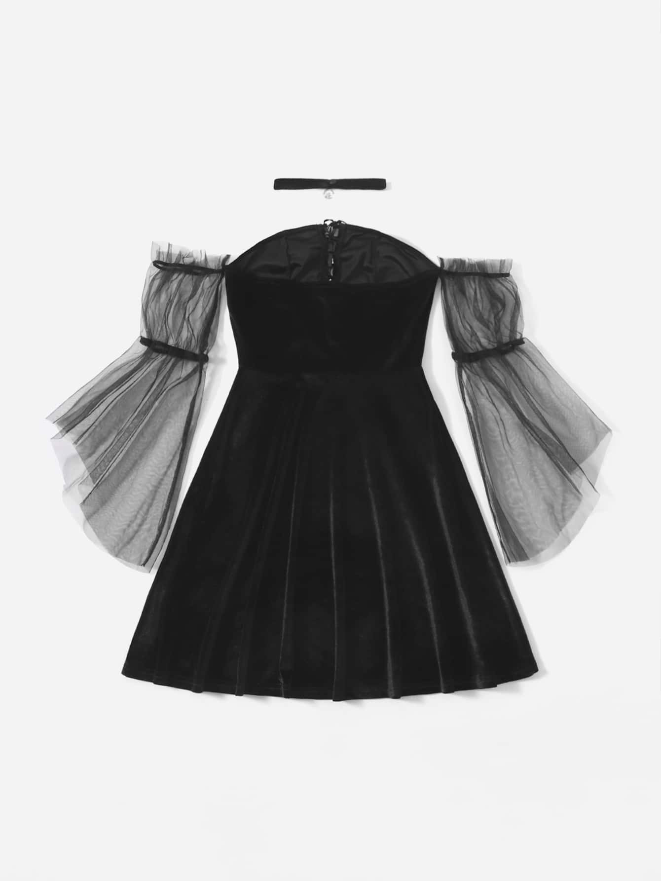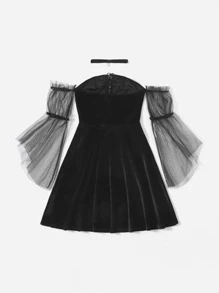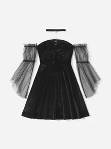 Off Shoulder Contrast Mesh Velvet Dress With Choker
