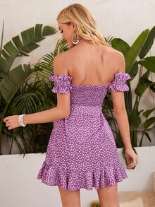 Off Shoulder Cut Out Tie Front Ruffle Trim Ditsy Floral Dress