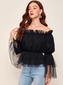 Off Shoulder Ruffle Trim Mesh Peplum Top