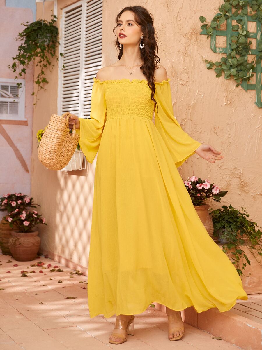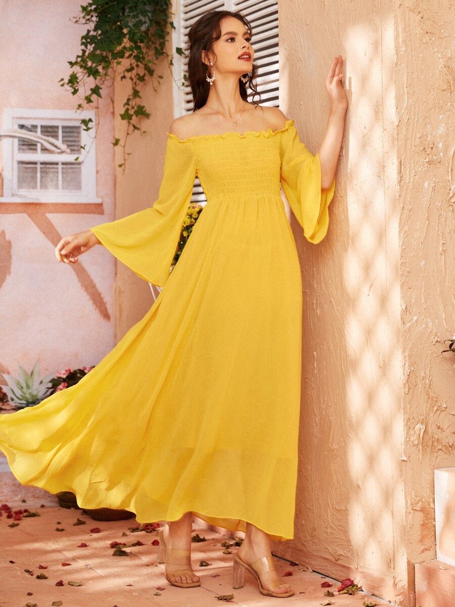 Off Shoulder Shirred Bell Sleeve Dress