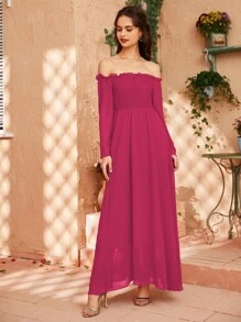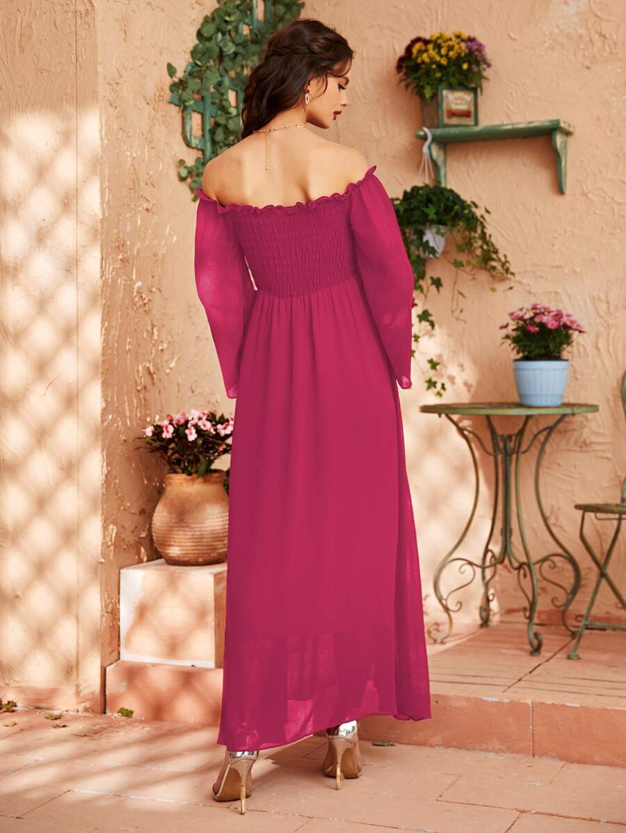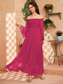 Off Shoulder Shirred Bell Sleeve Dress